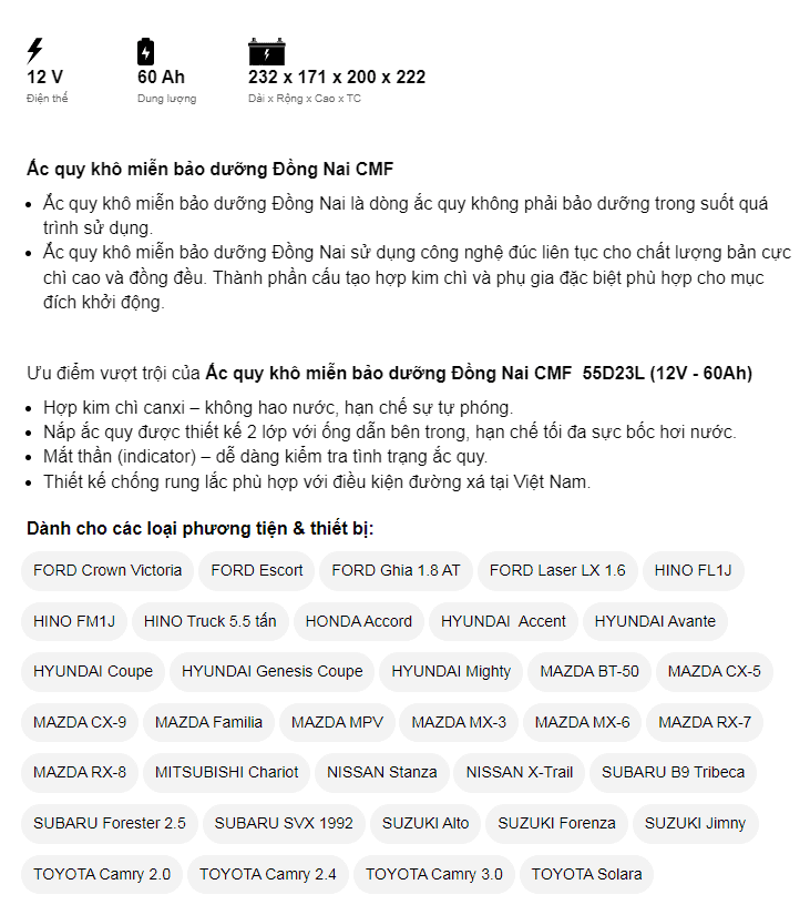 Dòng CMF là ắc quy miễn bảo dưỡng (ắc quy khô, kín) của Đồng Nai đảm bảo về chất lượng cũng như giá thành sản phẩm. Ắc quy làm từ hợp kim chì canxi có bổ sung thiếc, bạc nhập khẩu từ Úc nên không hao nước, hạn chế sự tự phóng điện. Nắp bình được thiết kế 2 lớp với ống dẫn bên trong, giúp giảm tối đa sự bốc hơi nước. Trong bình trang bị bộ phận lọc chống bắt lửa – an toàn khi sử dụng và Indicator (mắt thần) – dễ dàng kiểm tra tình trạng ắc quy.