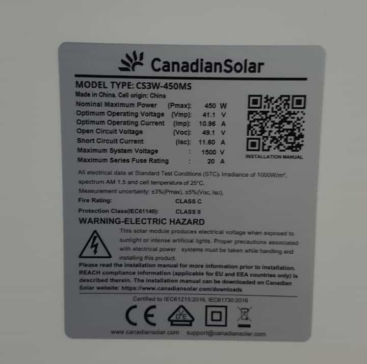 * Chứng chỉ an toàn, chất lượng Tấm pin năng lượng mặt trời Mono Canadian Solar 450W (CS3W-450MS)