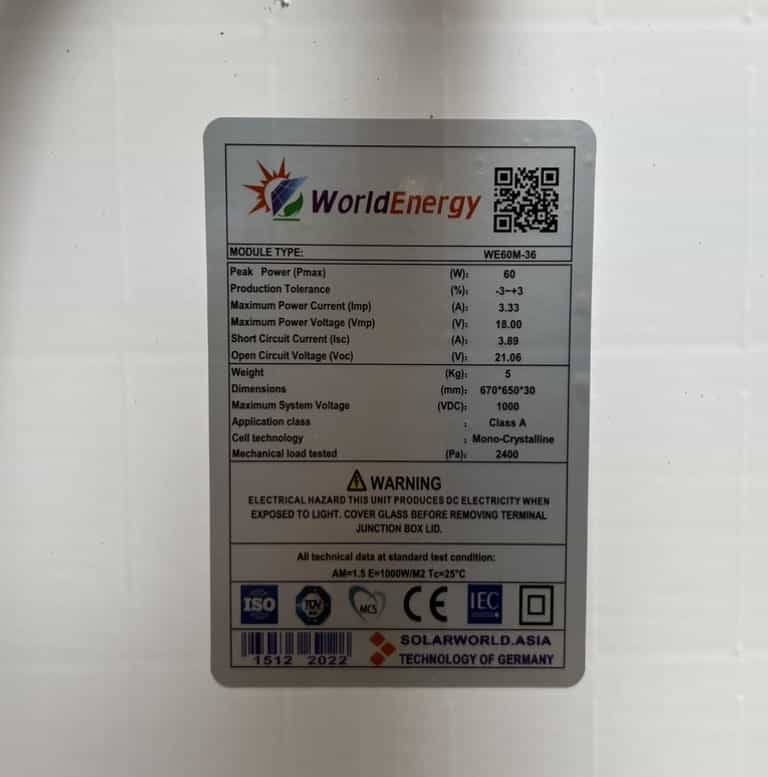 Thông số kỹ thuật TẤM PIN NĂNG LƯỢNG MẶT TRỜI MONO 60W WORLDENERGY